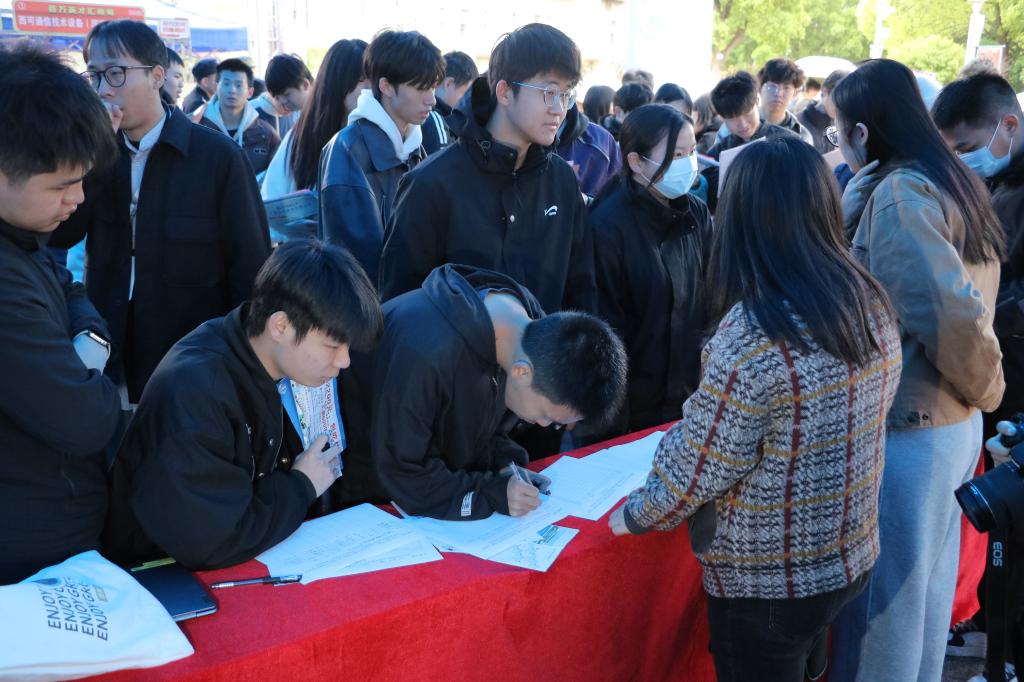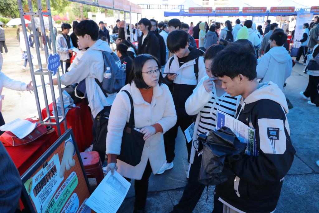 作为活动主场地,我校充分发挥校企协同优势,提前完成场地布置工作。活动当日,国旗护卫队全程维持现场秩序,青年志愿者为求职者提供“一站式”引导服务,保障招聘会高效运转。这场辐射河源大学城的就业盛会吸引了超3000名学生入场求职,现场气氛热烈,互动频繁。