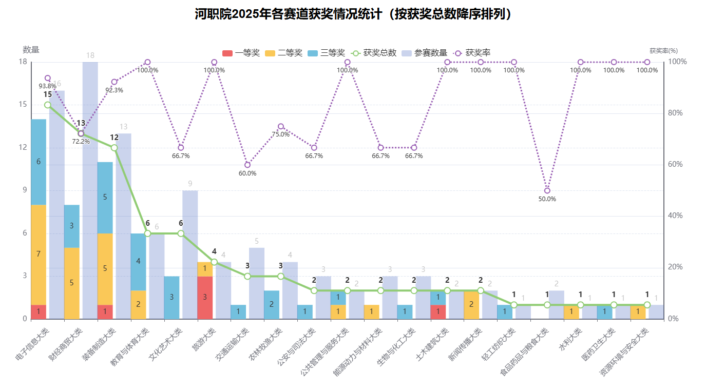 获奖质量突破历史新高:斩获62 项大奖(一等奖 6 项、二等奖 26 项、三等奖 30 项),获奖率 78.5%,二等奖数、获奖总数仅次于深圳职业技术大学,三等奖数位居全省第一。