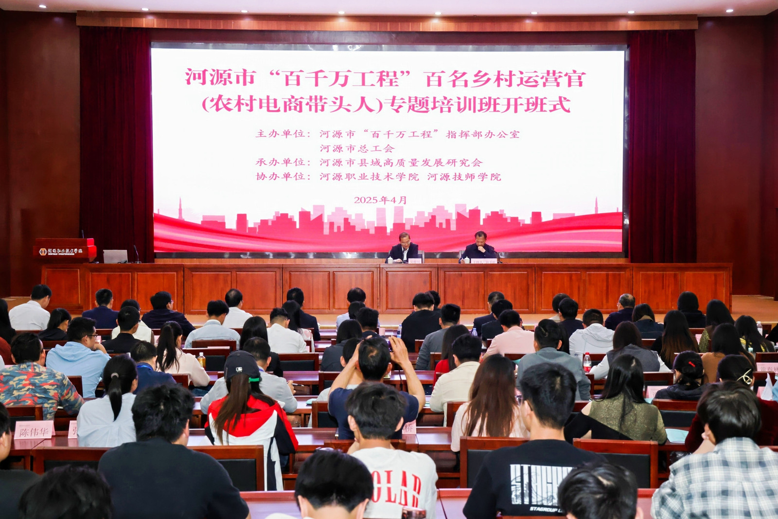 4月7日,河源市“百千万工程”百名乡村运营官(农村电商带头人)专题培训班开班式在我校学术交流中心报告厅举行。培训班由河源市“百千万工程”指挥部办公室与总工会主办、河源市县域高质量发展研究会承办、开云官方网页版与河源技师学院协办,市委副书记吴青川,我校校长刘贻新,市总工会常务副主席黄远程,市“百千万工程”指挥办、市人社局、市农业农村局、市商务局、市文广旅体局、河源技师学院、河源理工学校等分管负责同志以及106位农村电商带头人学员出席开班式。开班式由市人大常委会党组成员、副主任,市总工会主席钟壬旺主持。