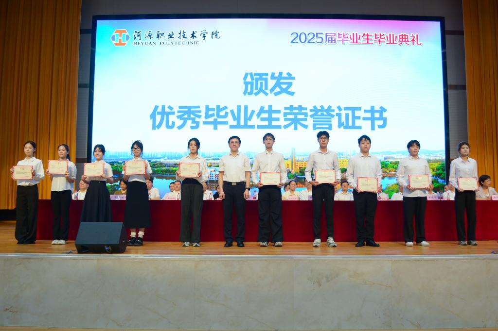 最后,刘贻新校长致辞,在同学们求学的这三年期间,正值我国国际影响力持续增强、河源市产业飞速发展的关键时期,我们的学校也荣幸地晋升为省级高水平学校。2024年高职生的就业率稳定保持在90%以上,这一数据甚至超过了本科生,这充分展示了职业教育的巨大潜力。在讲话中,他特别表彰了吴书雨、陈钰婷等优秀学生和优秀的班集体。同时,对即将步入社会的学生提出了几点期望:保持学习的热情、勇于创新和创造、铭记社会责任,并期望他们能够为国家和地方的发展贡献自己的力量。