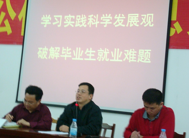 为了响应我校深入学习实践科学发展观活动的号召,认真贯彻“广东省2009年普通高校毕业生就业工作会议”精神,进一步搞好我校毕业生就业工作,学校于3月24日下午在就业中心召开了“学习实践科学发展观,破解毕业生就业难题”专题会议,校长刘安华、党委副书记韦荣出席会议并发表讲话,参加会议的有学工处相关人员、各院系副书记、辅导员、学生代表等,会议由学工处负责人主持。