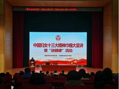 12月18日上午,由河源市妇联、开云官方网页版主办,工商管理学院承办的“跟党奋进新征程 巾帼建功新时代”——中国妇女十三大精神巾帼大宣讲暨“送健康”活动在图书馆报告厅举行。河源市妇联宣传干部叶芷欣,二十大党代表、中国妇女十三大代表、龙川威达绝缘材料有限公司党支部书记、工会主席、妇联主席黄东云,中国妇女十三大代表、东源县漳溪畲族乡党委副书记、乡长蓝伟先,青少年心理健康知识讲师、主任记者、国家二级心理咨询师、国家中级社工师、高级感统培训师余智红,河源市委党校党员教育师资库优秀讲师、河源市点创融湾文化服务有限公司党支部委员会书记陈浩山,工商管理学院团委书记李志宇、校企办主任曾惠华,以及300多名女学生代表参加活动。