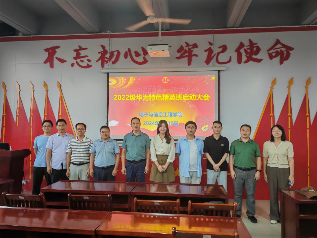 9月10日下午,电子与信息工程学院22级华为特色精英班启动会在实A306举行。学院王富宽院长、周永福副院长、校企办叶红卫主任,广州腾科网络技术有限公司培训部罗文迪经理,教师代表和精英班全体学生70余人参加活动。