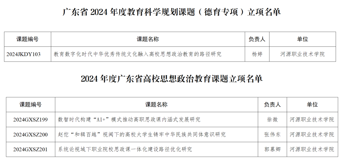 近日,2024年度教育科学规划课题(德育专项)和广东省高校思想政治教育课题立项名单相继公布,我院教师在此次课题申报中表现突出,共立项省级课题4项。其中,杨婷老师主持的课题《教育数字化时代中华优秀传统文化融入高校思想政治教育的路径研究》成功获批2024年度教育科学规划课题(德育专项)立项,同时,徐微、张伟东、郭慕卿三位老师分别主持的课题也成功获批2024年度广东省高校思想政治教育课题立项。
