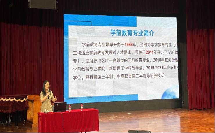 活动开篇,学前教育专业负责人廖佳仪主任做了详尽而精彩的专业解读。她利用图文并茂的PPT,从学前教育专业前景、培养目标、课程体系、师资力量、实训条件及就业方向等多个维度进行了深入浅出的介绍。她指出,学前教育专业秉承“师德为先、幼儿为本、能力为重、终身学习”的理念,构建了“理论与实践并重、艺术与技能交融”的课程体系。她还展示了校内外先进的实训基地,包括学前教育综合实训室、感觉统合训练室、儿童手工实训室等,并介绍了本市多家与我校有紧密合作关系的省级示范幼儿园。