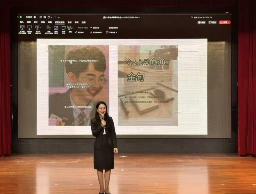 讲座中,池潇潇老师围绕自我定位、求职着装、仪态举止、沟通表达等多个维度展开讲解,并结合热门综艺《令人心动的offer》中的真实求职案例,生动细致地解析了求职礼仪的关键要点。她指出,恰当的求职礼仪不仅体现了对他人与场合的尊重,更是展现个人职业素养与综合能力的重要窗口。在互动环节中,池潇潇老师针对举止礼仪规范及面试过程中的细节把控进行了现场演示与指导,现场气氛活跃,反响热烈。