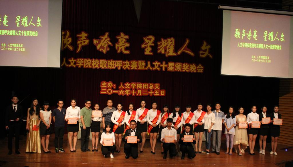 10月25日晚,我院于学术报告厅举行2016年校歌班呼决赛暨人文十星颁奖晚会。学院负责人罗春娜、副院长谢战锋、办公室主任刘少燕、全体辅导员、参赛班级及人文十星参加了此次活动。