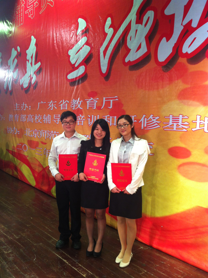 5月12日,第二届广东省高校辅导员职业技能培训暨竞赛活动在北京师范大学珠海分校落下帷幕,我校选派的辅导员陈慧枫、谢国栋、刘丽娟等三名老师均获奖。其中,陈慧枫获全省三等奖,谢国栋、刘丽娟分别获得优胜奖。这是继去年我校在首届全省辅导员职业技能大赛获奖后再次获奖。